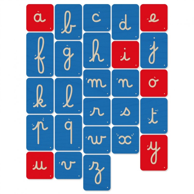 Ce coffret se compose de 26 planches individuelles en bois, représentant chaque lettre de l’alphabet cursif.